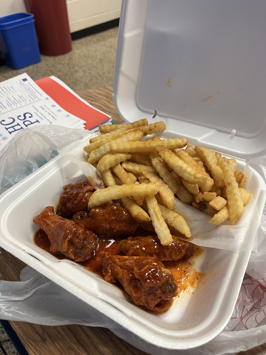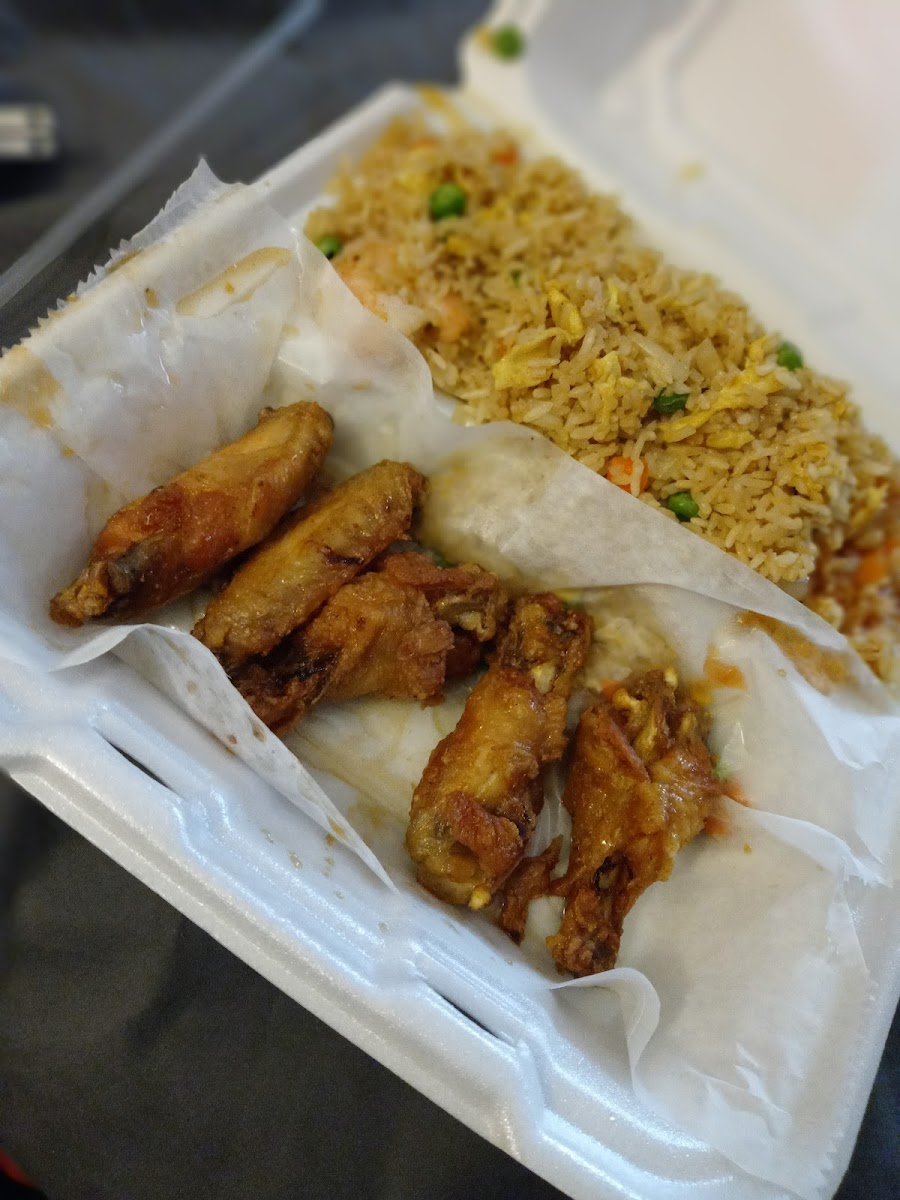 Best wings in town- hands down. Always crispy, hot, quick, and gooooood! The hot actually have good spice and amazing flavor- I literally crave their hot wings. The fried rice will rival any expensive hibachi restaurant in town too.